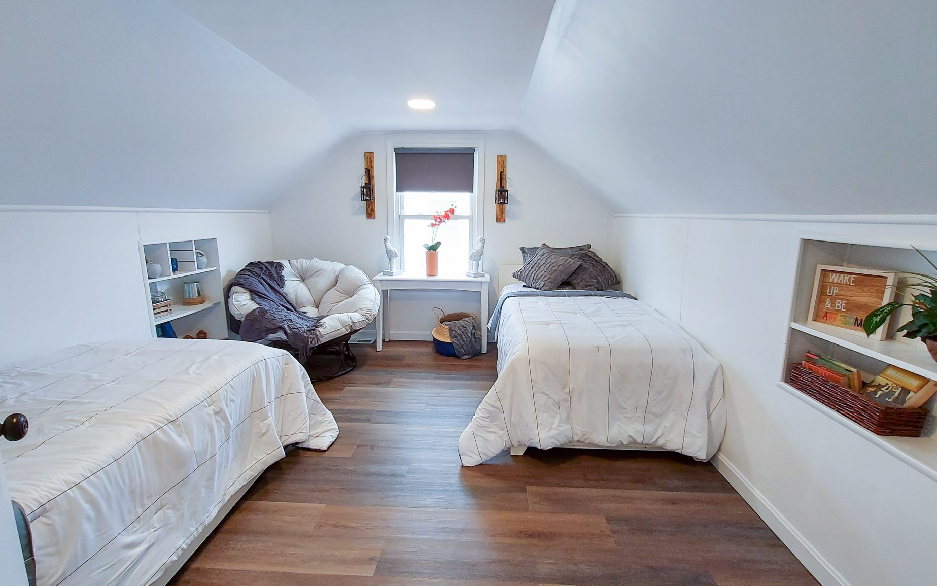 Our third bedroom features two twin size beds, one with a trundle bed, comfortably sleeping up to 3 people. Each bed has a quality mattress and a memory foam mattress topper, covered in bamboo cooling mattress protector. Enjoy a restful sleep with our darkening blinds or curtains. Our Papasan chair is all kids’ favorite in that room! Extras: Phone charger, extension cord, fresh set of towels. If you need to use the trundle bed, please let us know in advance so we can prepare it for you.