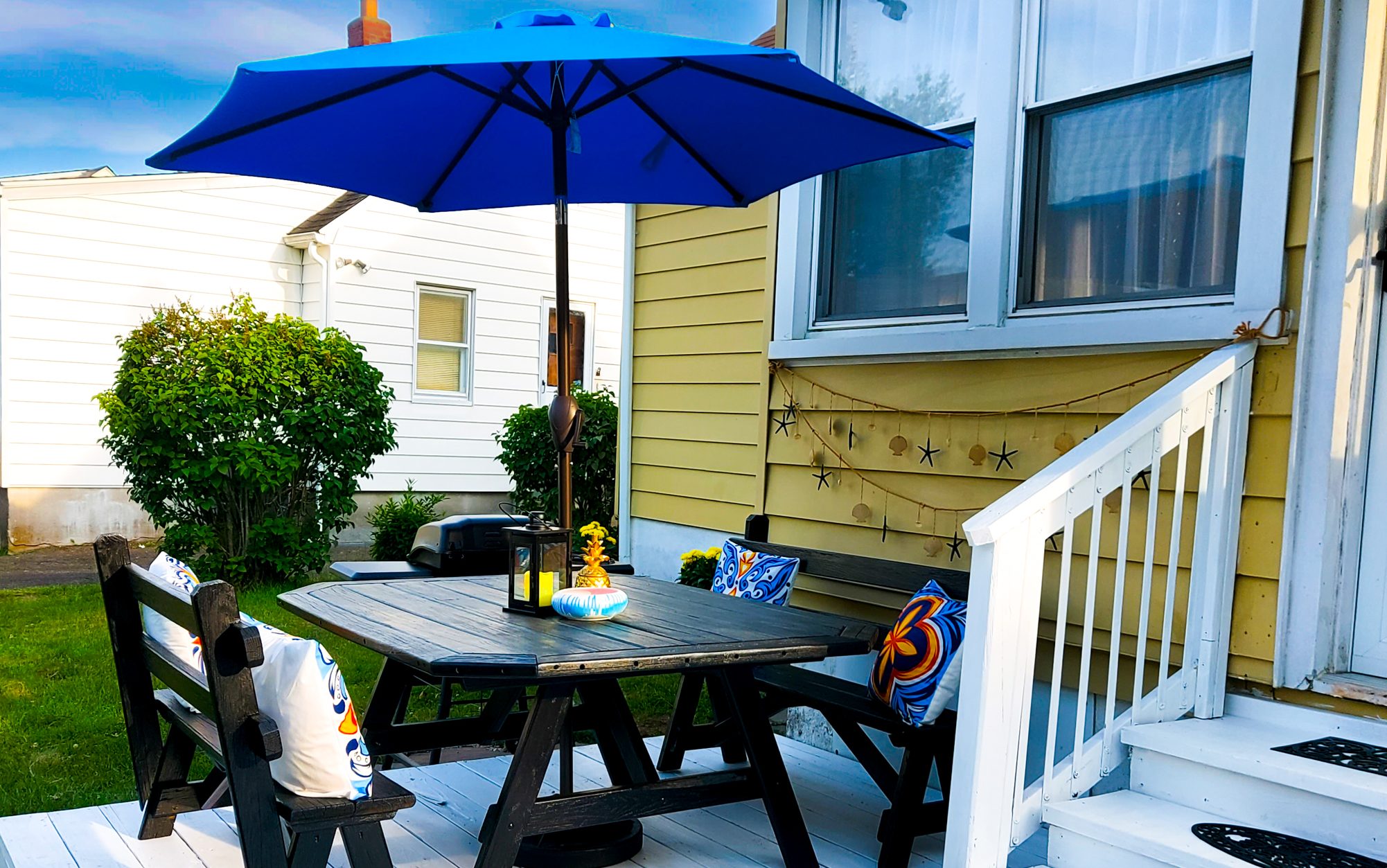 - A designated dining area on the patio. Please, fold the umbrella when not in use to prevent wind damage.